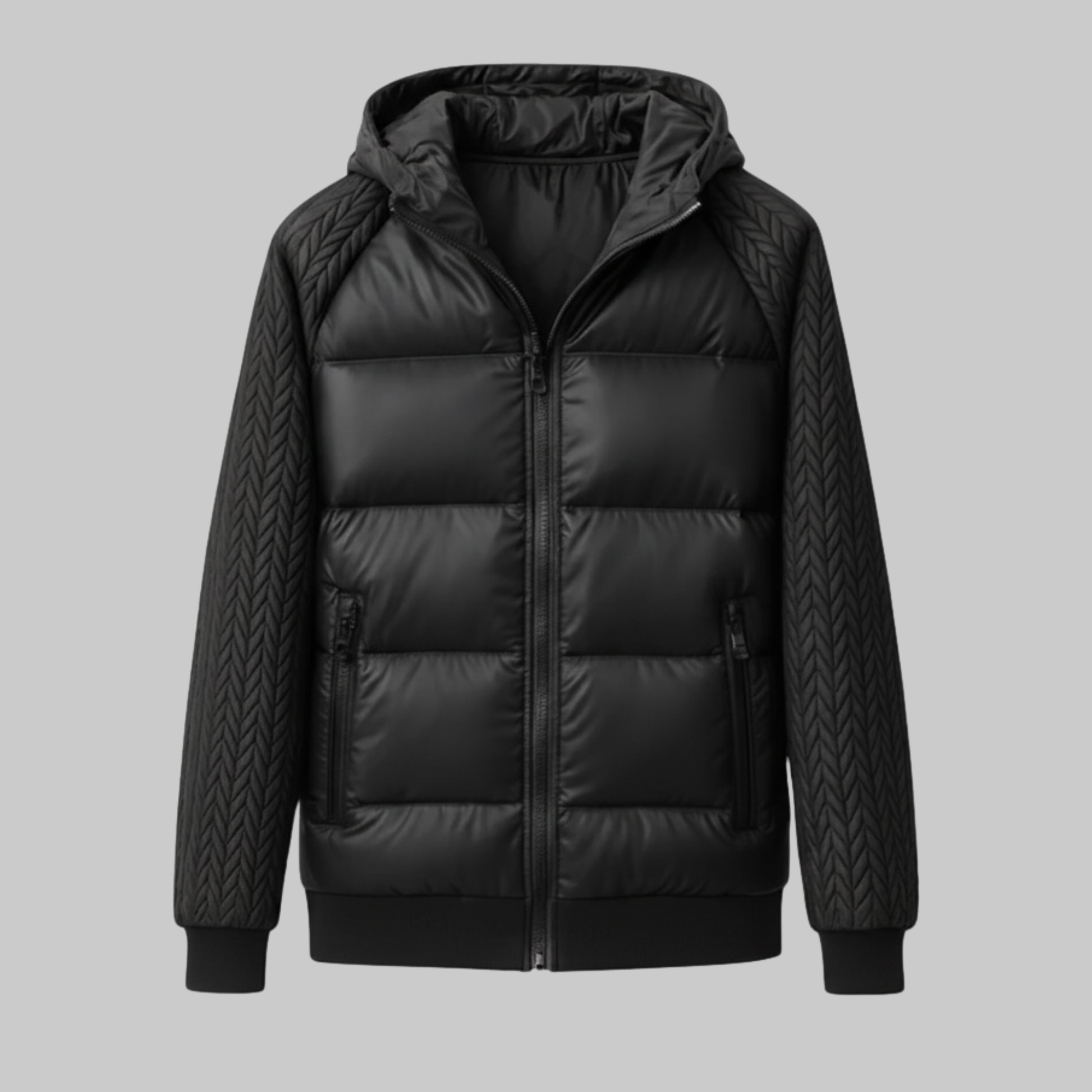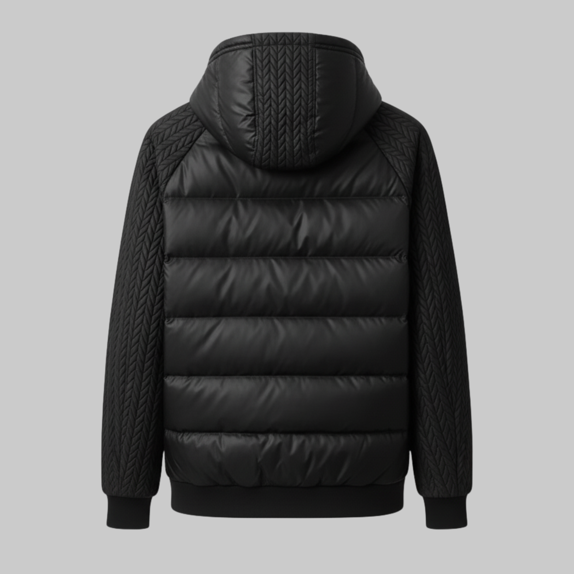 The Kael Jacket blends modern functionality with minimalist sophistication. Crafted from a matte padded shell for warmth and comfort, it features textured knit sleeves that add structure and depth. The hooded design and full-zip closure create a clean, versatile silhouette — ideal for colder days in the city. With its tailored fit, tonal hardware, and understated detailing, the Kael Jacket delivers warmth without bulk, bringing together technical precision and effortless style.
